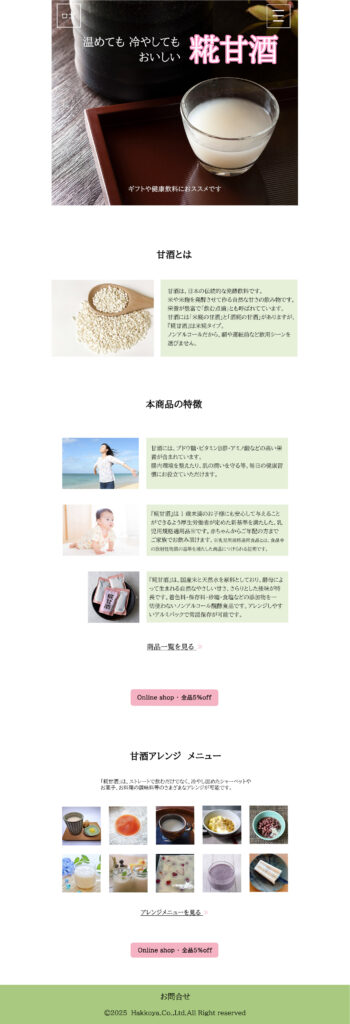 該当するLPの内容を全て盛り込んで作ったつもりが、デザインカンプを作ってみるとオンラインショップ以外にリンクするページ(商品一覧を見る・アレンジメニューを見る)が必要であると気付き、その文字を追加した。