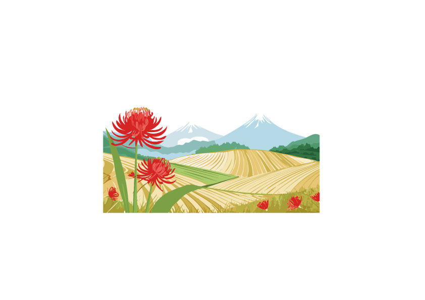 ①「田んぼの畦道に咲くヒガンバナ」 → 田んぼではなく美瑛の丘みたい。富士山が2つ?